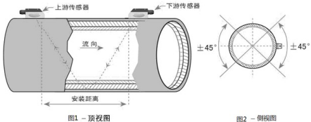 兩個傳感器應該安裝在管道軸面的水平方向上,在45°范圍內安裝,以防止上部有不滿管、氣泡或下部有沉淀等現象影響傳感器正常測量。