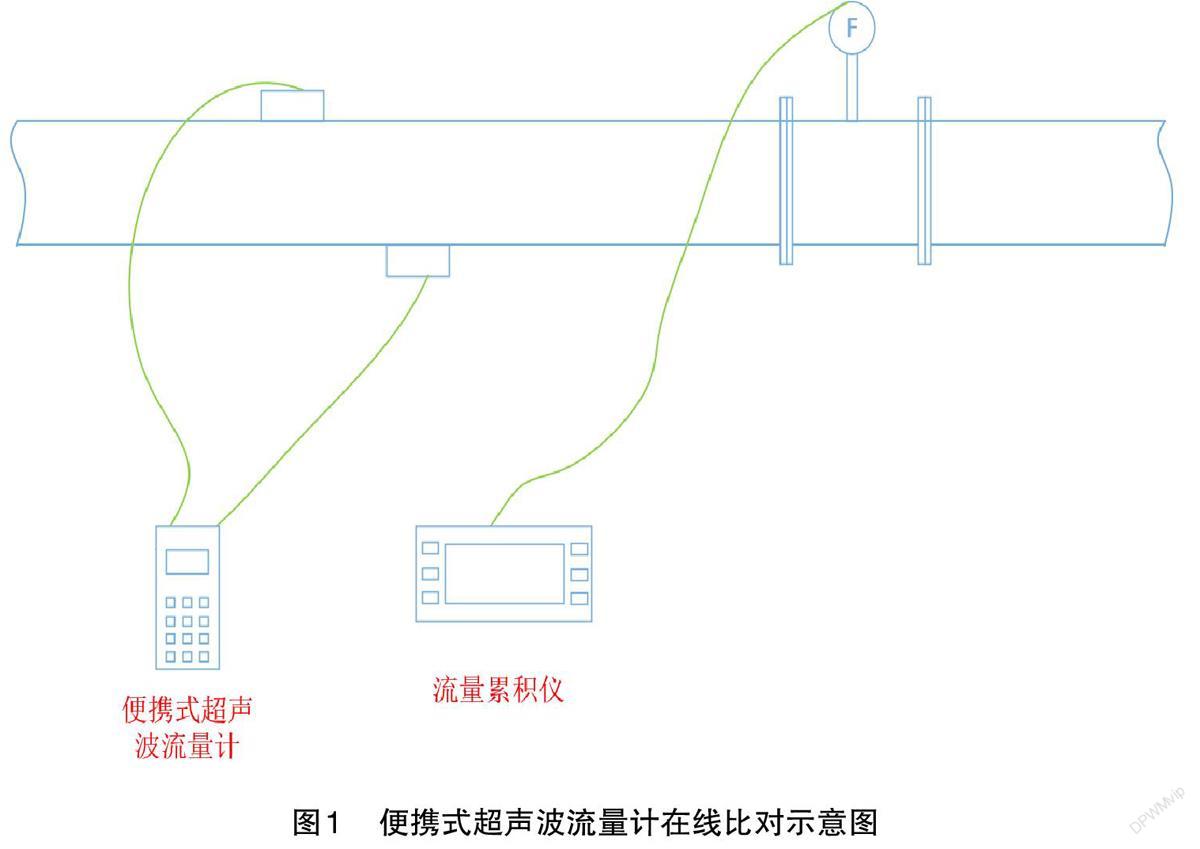 實際工作中,多為用經(jīng)過檢定合格的便攜式超聲波流量計(標(biāo)準(zhǔn)表)與現(xiàn)場流量計進行串聯(lián),記錄標(biāo)準(zhǔn)表和現(xiàn)場流量計的瞬時流量、累計流量,從而進行在線比對校準(zhǔn),具體見圖1。常見介質(zhì)為生產(chǎn)水、生活水、循環(huán)水、污水、壓縮空氣等。